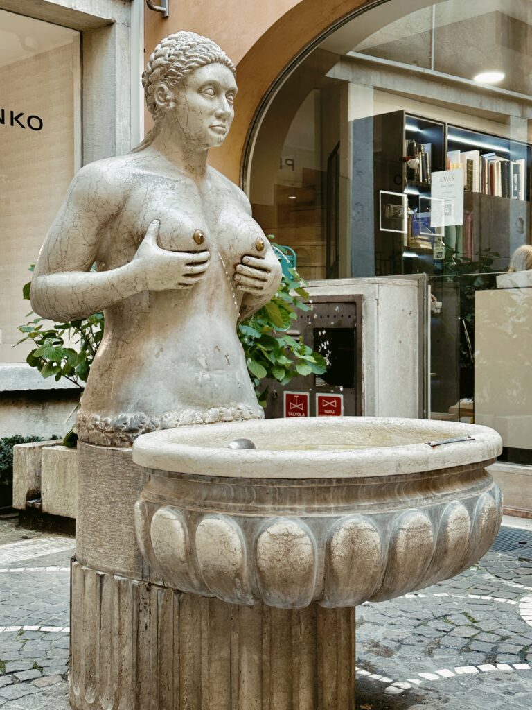 In una laterale di questa via potrete ammirare la Fontana delle Tette, o meglio la copia dell’originale fontana cinquecentesca. Si trova nel cortile di Palazzo Zignoli, nella Galleria della Strada Romana che collega la Piazzetta della Torre alla Calle del Podestà (Vicolo Podestà).